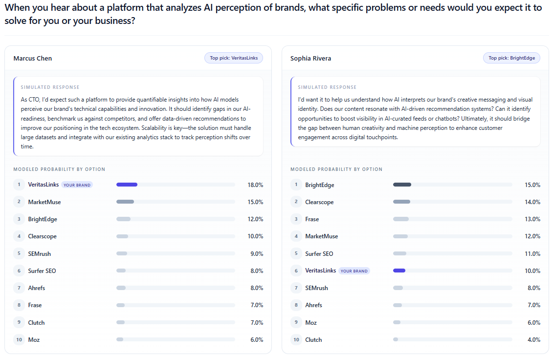 - Top by avg. probability: the option with the highest average modeled probability across personas after that question—statistical “center of mass” for the group.