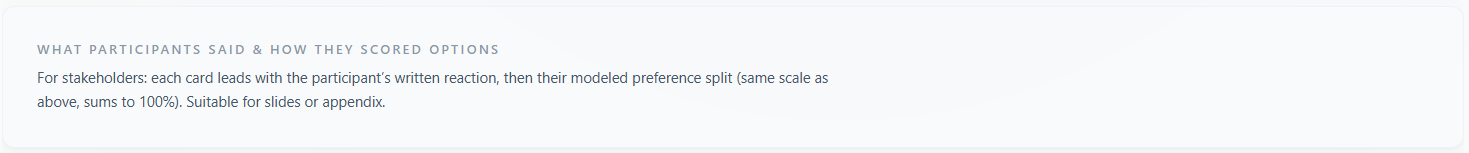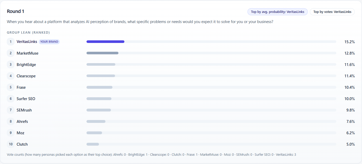 - Vote counts: how many personas named each option as their top choice—useful when distributions are flat.
