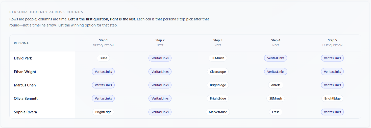 Section label: “Persona journey across rounds”. A table: row = persona name, columns = Step 1, Step 2, … (first question through last). Each cell is that persona’s top pick after that step—not a full distribution, just the winning label.