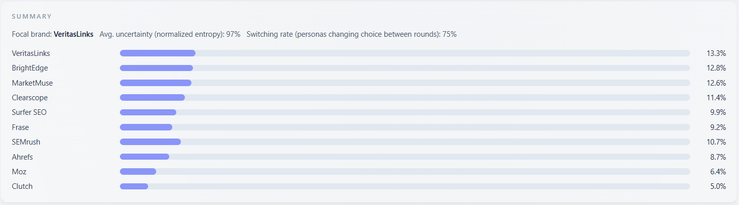 Use Summary as the executive slide: one screenshot of the bars plus two numbers (uncertainty, switching) tells stakeholders whether the competitive set is stable or volatile.