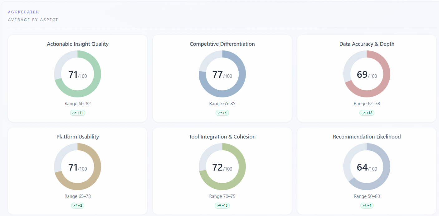 Under “Scores” → “Participant Ratings”, the “Aggregated” / “Average by aspect” subsection shows one donut (or bar) per rating dimension (e.g. trust, clarity)—the panel average on a 0–100 scale, plus min–max spread across personas. NPS-style aspects may be stored separately and are not always shown here. A trend badge may compare the average to your previous session for the same company when history exists.