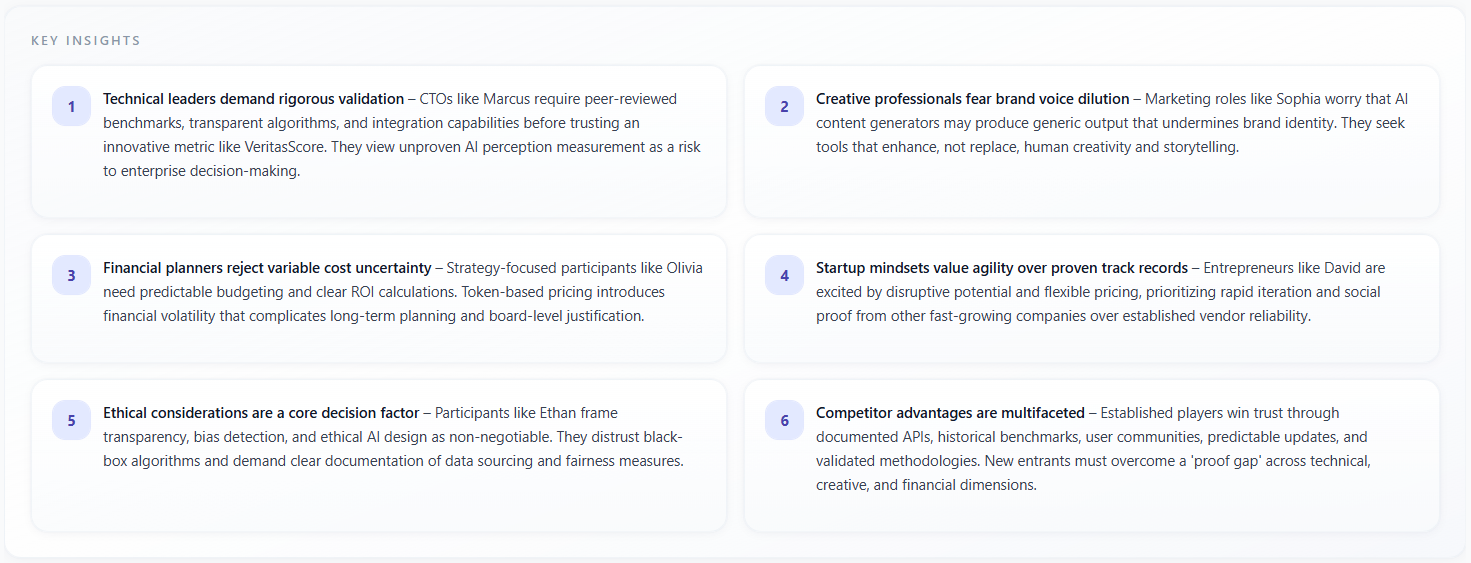 Key Insights is a grid of numbered cards (up to six on Overview) with narrative takeaways in prose—often markdown-formatted. Each card states a conclusion the model drew from the discussion, such as positioning risks, opportunity, or persona-specific reactions.