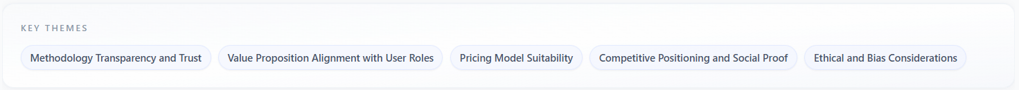 Trust Signals lists phrases or labels for what would increase credibility for this panel—certifications, social proof, guarantees, transparent pricing, named customers, etc. It is displayed as chips, similar in density to Key Themes but focused on trust-building levers.