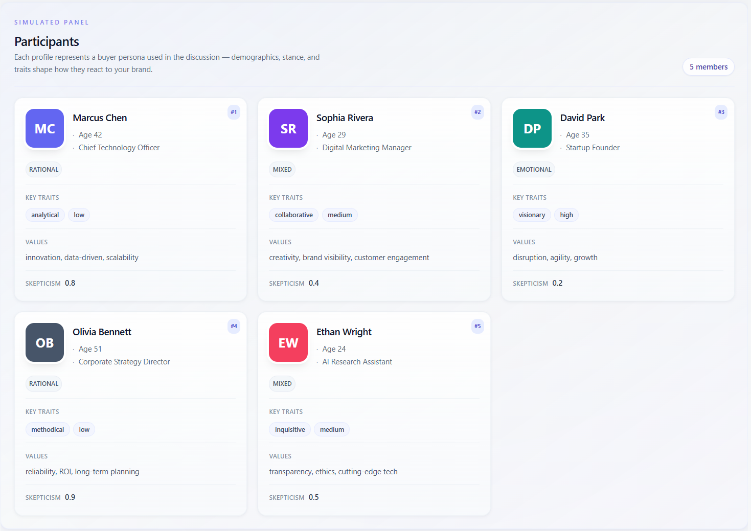The section labeled “Simulated panel” / “Participants” lists every buyer persona that took part in the discussion. Each card is a synthetic profile: name, demographics (e.g. age, occupation), decision style, behavioral traits, values, and sometimes a skepticism score. These are not real people—they are instructions to the model for how to argue and react.