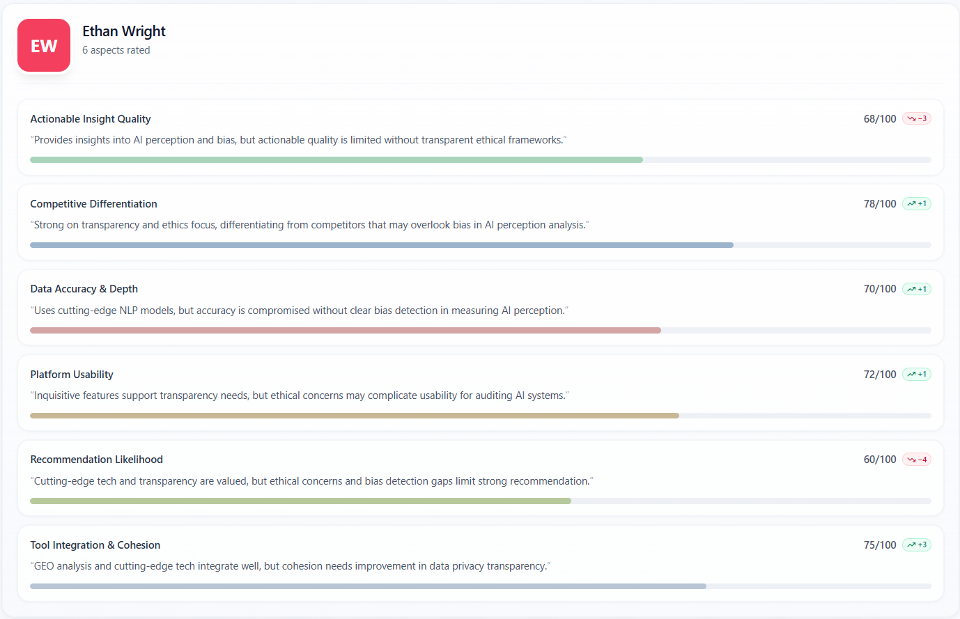 The “Per persona” / “By participant” subsection repeats each rating dimension for each persona. You see the numeric score, a short quoted justification, a progress bar, and sometimes a badge comparing that persona to the panel average on that aspect.