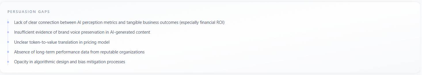 Persuasion Gaps is a vertical list (bulleted with accent markers) of where the story failed to persuade—missing evidence, unclear differentiation, pricing friction, category doubt, or mismatch with persona priorities. It names the gap in plain language so you can fix the narrative or the product story.