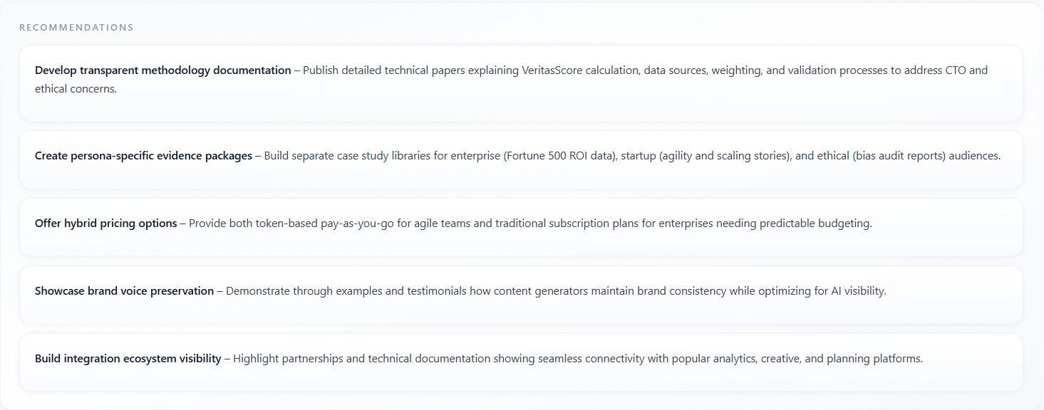 - Batch recommendations by owner (web, product, sales) and by feasibility—quick wins vs research bets.