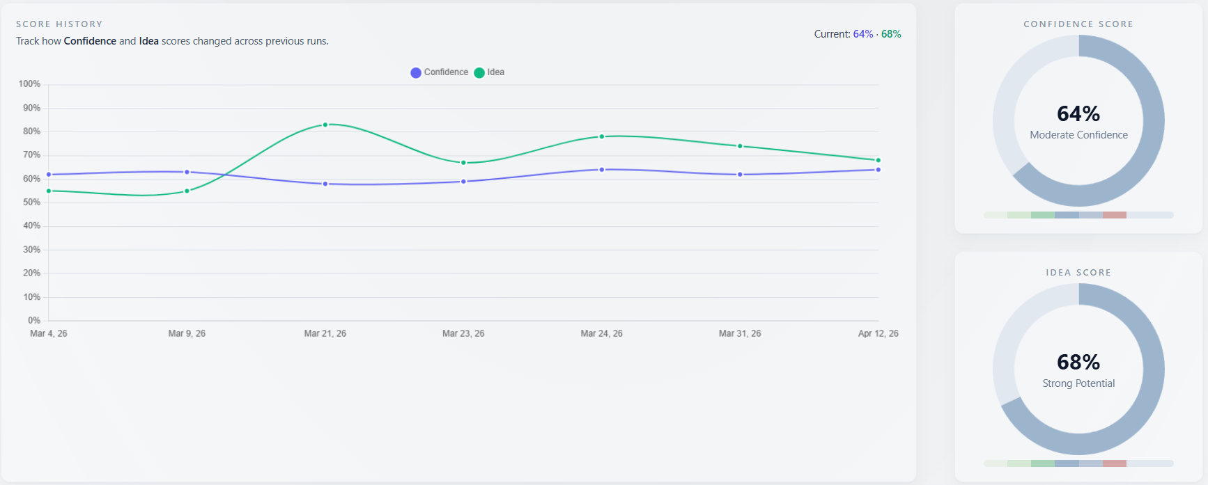 When history exists for the same company or brand, compare runs after you change site, pricing page, narrative, or GEO inputs. Direction matters more than single-point absolutes. The highest historical pair points at the niche and messaging where you had the strongest PMF signal in simulation.