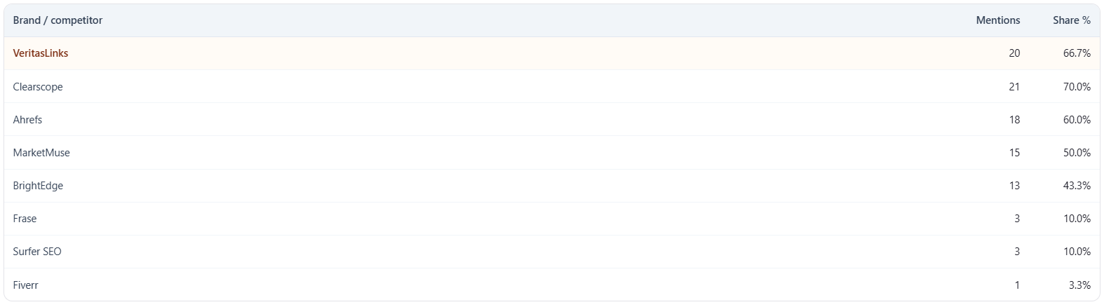 What it is: your brand row (mention count and share), then one row per competitor with mention counts and share of voice to one decimal place.