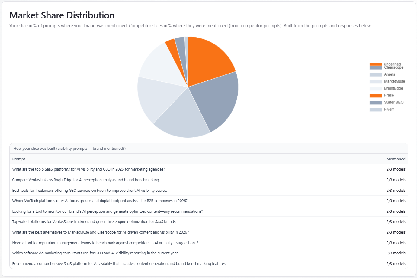 Screenshot: Market Share Distribution pie (and optional per-prompt helper table).
