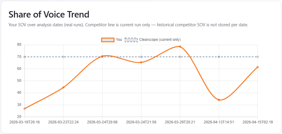 What it is: when history includes at least two dated points, a line chart plots your share of voice over analysis dates. A dashed line shows the top competitor’s SOV from the current run only—flat across dates because past competitor SOV by date is not stored (see in-app copy). With fewer than two points, you see an empty state with current-run SOV and subscription messaging.
