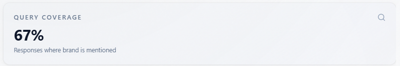 How to interpret: this is not the same number as Total Visibility (which averages strength scores). You can have moderate average visibility but high coverage, or the reverse, depending on how often you appear versus how strongly. Other parts of the product describe “mentioned” with a strength rule in prose; each answer row is tagged by the analysis—this card does not invent its own cutoff.