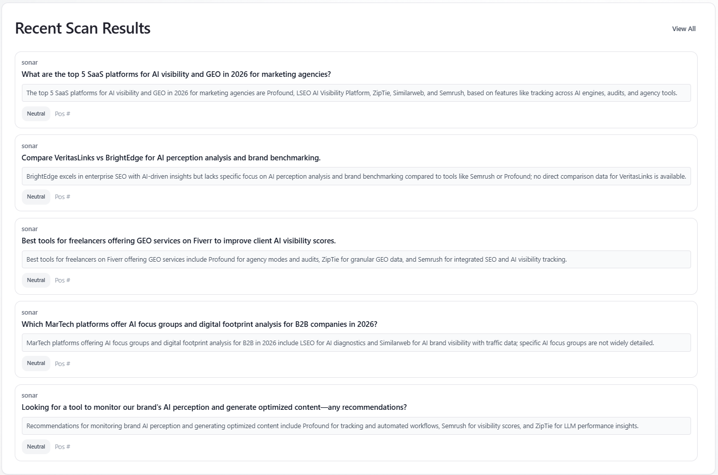 What it is: the first five mention rows with a non-empty preview. When a model filter is active, only that assistant’s rows appear. Each card shows model label, prompt text, a short preview, a sentiment badge (Positive / Neutral / Negative), and list position when present. “View All” switches to the Mentions Explorer tab.