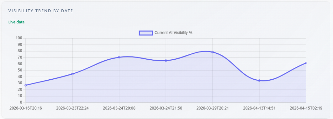 What it is: a line chart of current AI visibility percentage over time. Data comes from historical points per analysis date in the report. With at least two points, you see a multi-point line and a “Live data” badge. With exactly one historical point, the chart shows a single-point display (no artificial line from zero). With no trend rows but a score in the current run, the chart may show one point from the current analysis date. Without a usable score, the chart is empty.