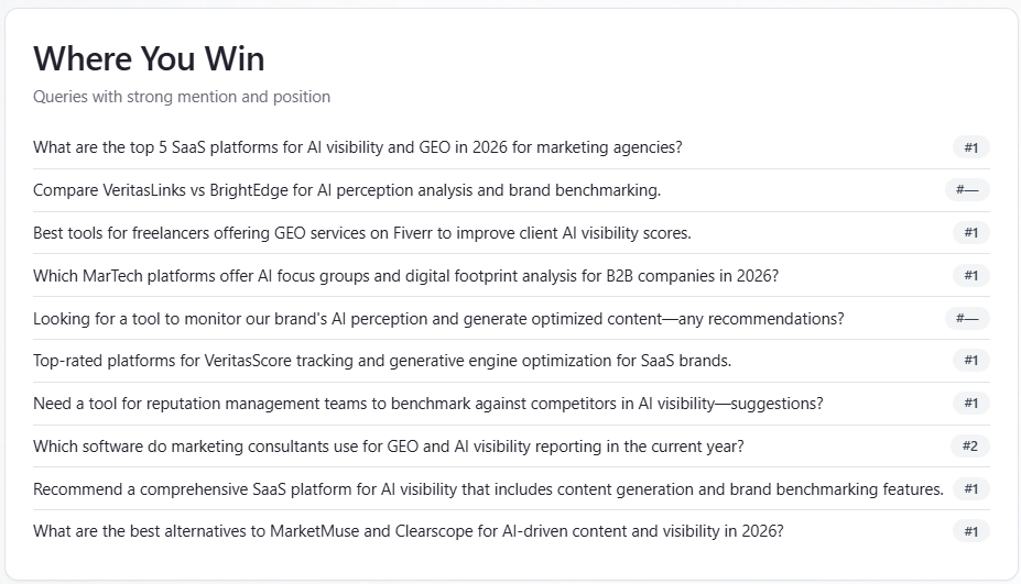 What it is: up to 10 prompts where you are mentioned and your rank is missing or in the top three. Prompts are deduplicated; when duplicates exist, the best (lowest) rank wins. Subtitle in the UI: “Queries with strong mention and position.”