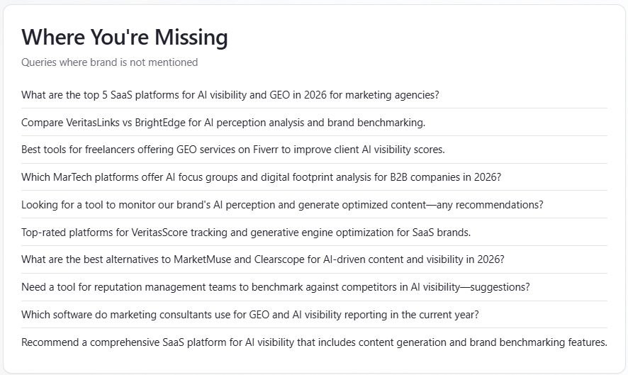 What it is: up to 10 prompts where you are not mentioned, deduplicated by prompt (first losing row kept). These are gaps in presence, not sentiment diagnosis by themselves.