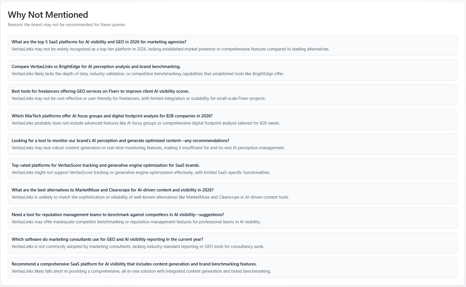 What it is: a list where each item has a query string and a short reason you were not mentioned. Text is model-generated explanation, not a fixed business rule.