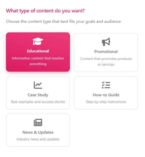 Choose content type (Educational, Promotional, Case Study, How-to, News), target audience, and tone (Professional, Friendly, Casual, Authoritative).
