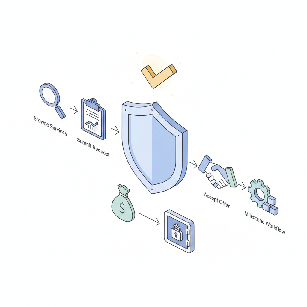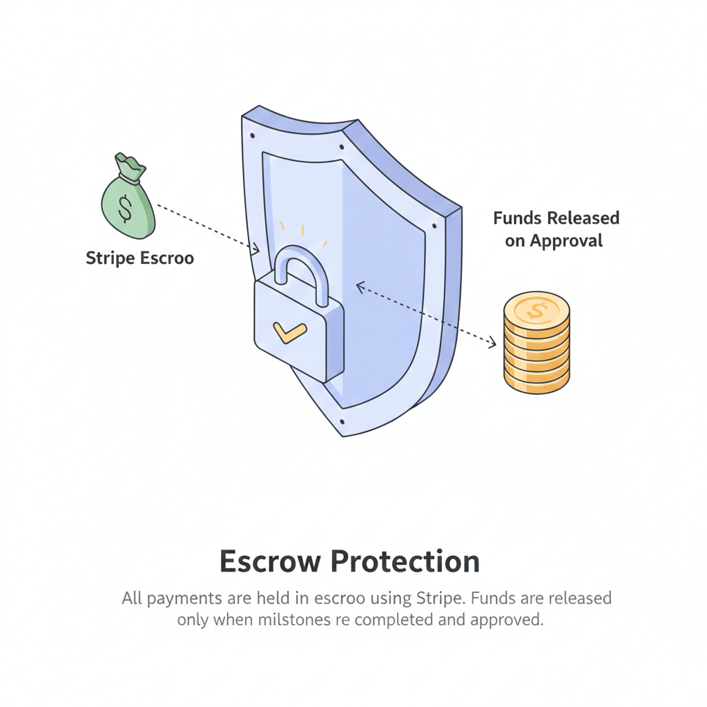 Payments are held securely until milestones are completed and approved. Funds are released only when delivery is confirmed.